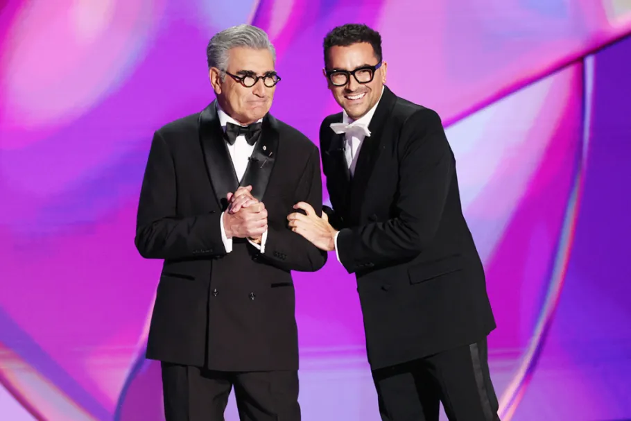 Father-son hosting duo Eugene and Dan Levy were affable, though not especially memorable, emcees. Only a bit about getting separated in the audience hit on the squabbling comedic chemistry that won both of them Emmys. Their joint performance was otherwise smooth rather than lively, with a jab at the jokelessness of “comedy” heavyweight “The Bear” a rare instance of edge that got a rise out of the audience. In fairness, it’s hard to win over a crowd that’s surprisingly sparse, as L.A’.s Peacock Theater appeared to be on camera — but the response to the central trio of “Only Murders in the Building” was downright thunderous in comparison, presaging a potential Oscars hosting gig for Steve Martin, Martin Short and Selena Gomez.